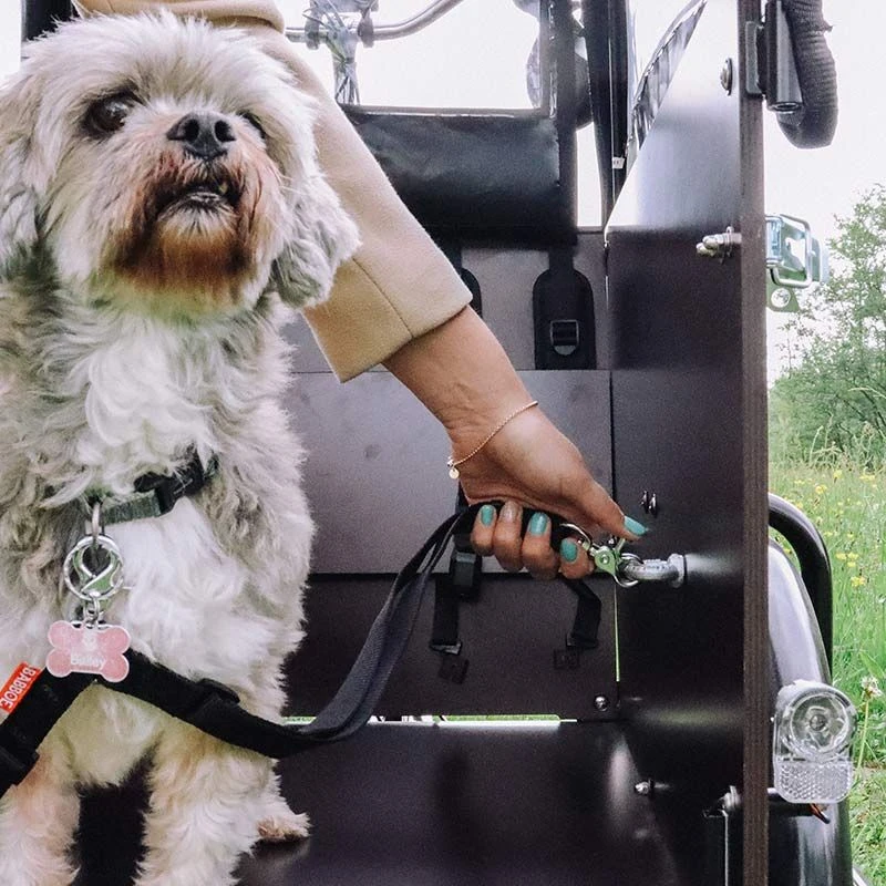 Avec la double laisse Babboe pour chiens, vous sécurisez votre compagnon à quatre pattes de manière optimale. Elle se fixe à droite et à gauche dans la caisse de transport Babboe. Les modèles de vélos cargo électriques Dog, Dog-E, Go, Go Mountain et Go-E sont adaptés à cet usage. Votre chien entre dans le box par la planche de marche. Vous fixez le mousqueton central au collier, tandis que les deux mousquetons extérieurs sont fixés aux dispositifs à droite et à gauche à l’intérieur de la Caisse de transport. La double laisse est réglable en longueur de 50 à 80 cm des deux côtés. Vous pouvez ainsi adapter la longueur à votre chien.