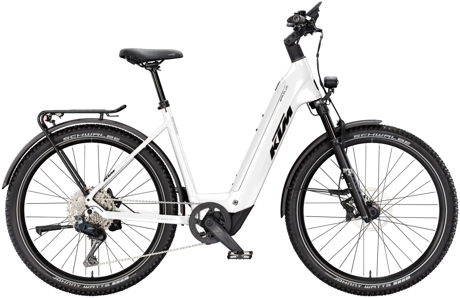Le KTM Macina Aera 871 LFC combine la sportivité d’un VTT électrique avec un enjambement bas confortable et un équipement urbain pratique. L’Aera 871 LFC est équipé d’un système d’éclairage, de garde-boue et de pneus Schwalbe Johnny Watts, ce qui est idéal pour une utilisation en ville comme pour des randonnées sur des terrains accidentés. Le nouveau moteur Bosch CX et la batterie de 800 Wh offrent une puissance et une endurance suffisantes. De plus, toutes les données de conduite sont affichées sur l’écran TFT Kiox 500, très lisible.