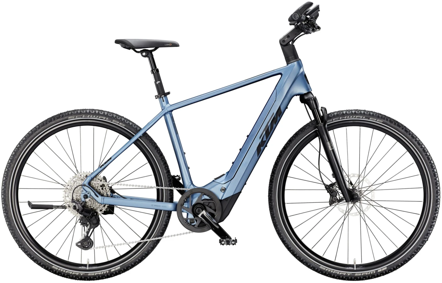 Année modèle: 2025 Type de vélo électrique: VTTAE semi-rigide, VTTAE XC, VTT électrique Forme du cadre: Femme / Trapèze, Homme Capacité de la batterie: 800 Wh – 899 Wh, Dual batterie possible Système d’entraînement: Moteur Bosch Fabricant: KTM Dérailleur/type de transmission: Dérailleur – chaîne Option batterie: Dual batterie possible Position de la batterie: Batterie Intube / intégrée Moteur Bosch: Bosch Performance Line CX à partir de 2025 Smart System Cadre: Macina Trekking Onroad Alliage 6061 Fourche: Suntour XCR34X Air 27,5″ 2CR 80mm taper Batterie: Bosch PowerTUBE 800Wh horizontal Pneus: Schwalbe Johnny Watts Perf. Folding DD 65-584 Reflex Selle: Selle Royal Lookin Lady Evo Tige de selle: Tige de selle KTM Team, débattement interne, réglable, 30.9 Porte-bagages: Racktime Alumee (compatible avec Snap-it 2.0 & Monkeyload) Poids: 27,8 kg Article: KTM Macina Cross CX 810 – 2025 Coloris: STEEL BLUE MATT Potence: KTM Line adjust. 0-60° ICR Ecran: Écran Bosch KIOX 500 TFT Béquille latérale: Béquille vélo KTM 28″ MY2025, réglable Roues: KTM Line – Shimano TC500B / KTM Line – Shimano Deore M5100 Débattement: Avant : 80mm Poignées: Ergon GP1 Evo Moteur: Bosch PERFORMANCE CX BDU3840 25km/h / 85Nm Eclairage arrière: Racktime Alu 72mm B&M Xeltec Eclairage avant: Litemove SEC-150 150Lux (avec connecteur CT1) Pedales: Pédales VTT plates VPE-527 alloy Taille de la roue: 27,5″ Guidon: KTM Comp rizer15 680mm Manivelle: KTM E-Comp2 ISIS 170mm Q8 Cassette: Shimano LG400-10 / 11-48 Dérailleur: Shimano CUES U6000-11/10 LG ombre+ Chaîne: KMC e500 LG e-bike Levier de vitesse: Écran Shimano CUES U6000-10 Chargeur: Bosch eBike chargeur standard 4A Disque de frein: Tektro TR-45 2.3mm CL 180 / TR-45 2.3mm CL 180 Unité de commande: Bosch eBike LED Remote Frein: Tektro HD-M535 4 pistons