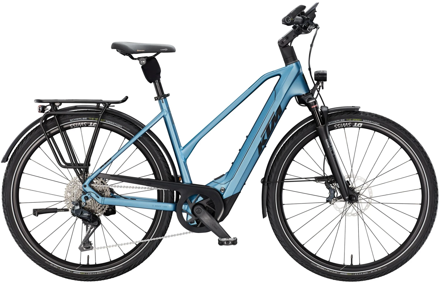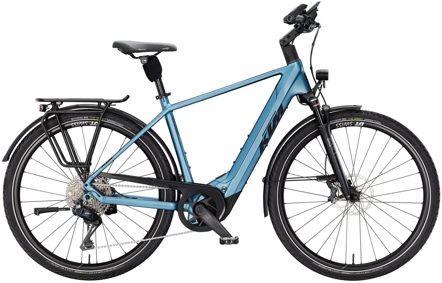 Année modèle: 2025 Type de vélo électrique: VTC électriques, VTTAE XC Forme du cadre: Femme / Trapèze, Homme Système d’entraînement: Moteur Bosch Fabricant: KTM Capacité de la batterie: 800 Wh – 899 Wh Dérailleur/type de transmission: Dérailleur – chaîne Position de la batterie: Batterie Intube / intégrée Moteur Bosch: Bosch Performance Line CX à partir de 2025 Smart System Cadre: Macina Trekking Onroad Alliage 6061 Fourche: Suntour NCX32-E Air LO 63mm 15QLC Al 1 1/8 Batterie: Bosch PowerTUBE 800Wh horizontal Pneus: Schwalbe Green Marathon Perf. GreenGuard 50-622 Selle: Selle Royal Lookin Man Tige de selle: Suntour SP17-NCX suspension 30.9/350 Porte-bagages: KTM tour (Snap-it 2.0 + Monkeyload) Poids: 27,1 kg Article: KTM Macina Style 810 Di2 – 2025 Coloris: STEEL BLUE MATT Potence: KTM Line adjust. 0-60° ICR Ecran: Écran Bosch KIOX 500 TFT Béquille latérale: Béquille vélo KTM 28″ MY2025, réglable Roues: DT Swiss HU 1900 Garde-boue: SKS A55K PET Trek 28″ Arrière Débattement: Avant : 63mm Poignées: Ergon GP30 Moteur: Bosch PERFORMANCE CX BDU3840 25km/h / 85Nm Eclairage arrière: B&M Dart brex Eclairage avant: B&M IQ-XM 120-170Lux HighBeam Pedales: Pédale de trekking VP-616 anti-slip Taille de la roue: 28″ Guidon: KTM Line rizer20 640mm Manivelle: KTM E-Team2 ISIS 170mm Q8 Cassette: Shimano LG400-11 / 11-50 Dérailleur: Shimano CUES Di2 U8050-11 SGS shadow Chaîne: KMC e11 Sport EPT e-bike Levier de vitesse: Shimano Di2 EN605 sans fil Chargeur: Bosch eBike chargeur standard 4A Disque de frein: Shimano RT64 CL 180 / RT64 CL 160 Unité de commande: Bosch eBike LED Remote Frein: Shimano CUES U8000 / U8020 4 pistons GPS: Bosch eBike ConnectModule