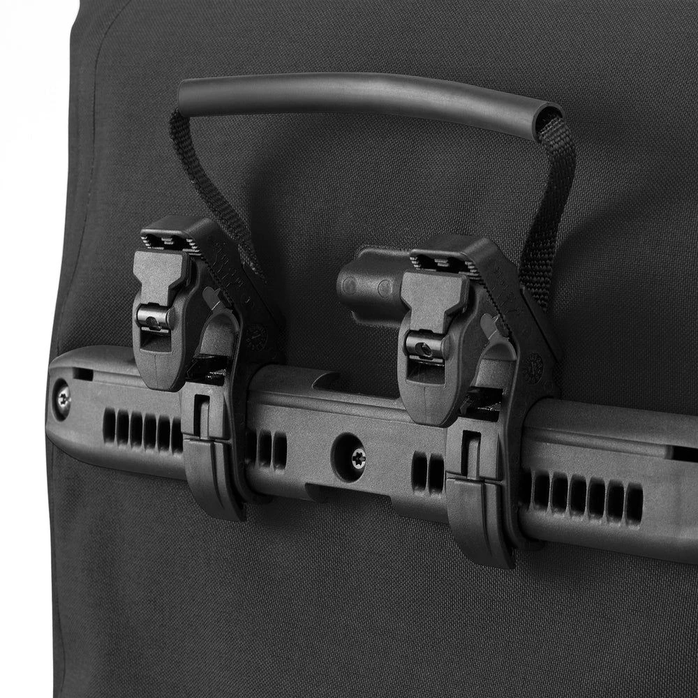 Outre son utilisation flexible au quotidien, le Ortlieb Vario Plus 26 litres offre également un équipement de qualité pour un confort maximal lors de l’utilisation des deux côtés de l’application. En utilisation comme sacoche vélo, le Ortlieb Vario Plus 26 litres est fixé en toute sécurité sur le porte-bagages vélo grâce au système Ortlieb Quick-Lock2.2. Les crochets QL2.2 se ferment automatiquement, sont réglables sur 10-16 mm et s’adaptent aux tubes de 8-16 mm de diamètre. Pour un maintien supplémentaire, le sac peut être fixé aux entretoises inférieures du porte-bagages à l’aide de crochets d’arrêt coulissants et pivotants. En cas d’utilisation comme sac à dos, le système de portage rembourré avec des bretelles ergonomiques et une sangle de poitrine assure toujours un port agréable et confortable. La poche frontale réversible, la poche latérale en filet pour les bouteilles d’eau, la fermeture à enroulement avec crochet de fermeture et la poignée de transport sont des caractéristiques supplémentaires pour les deux côtés d’utilisation.