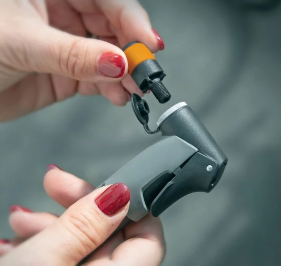 Avec l’adaptateur de tête de pompe, vous gonflez vos pneus de vélo rapidement et facilement. De plus, la combinaison de la valve SCV et de la tête de pompe permet d’éviter toute fuite d’air pendant le gonflage. Pour l’utiliser, l’adaptateur doit être fixé à une pompe vélo. Pour cela, il est possible d’utiliser aussi bien une pompe à air à pied avec valve qu’une pompe à air manuelle classique. Il est seulement important que la pompe dispose d’un embout AV, car c’est là que l’adaptateur de tête de pompe est serré ou vissé. Une fois l’adaptateur monté, il suffit de l’enfiler sur la valve sans trop forcer. Si la tête de pompe est correctement placée sur la valve SCV, elle s’enclenche de manière perceptible et audible. Ensuite, il suffit de gonfler le pneu comme d’habitude, de retirer l’adaptateur de la valve et, pour finir, de mettre le capuchon de valve.