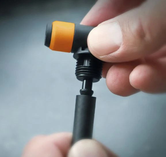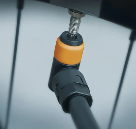La tête de la pompe vélo permet de gonfler facilement et rapidement le pneu du vélo. Pour cela, il suffit d’enfoncer la tête de pompe sur la valve SCV avec peu de force jusqu’à ce que l’on entende un clic perceptible et audible. La tête de la pompe vélo entoure alors complètement la valve et évite ainsi que l’air ne s’échappe. Le pneu vélo est gonflé comme d’habitude, la tête de pompe est retirée et le capuchon de valve est placé sur la valve. Outre l’utilisation, le montage est également très simple. La tête de pompe Schwalbe Clik Valve se fixe sur une pompe à air à valve. Pour cela, il suffit de retirer la tête de pompe d’origine et de la remplacer par la tête de pompe SCV. Si l’extrémité de la chambre à air est un peu étirée, il est possible de couper avec précaution un morceau de 1 cm de large de la chambre à air à l’aide d’un cutter. La tête de pompe SCV devrait maintenant être bien placée dans la chambre à air de la pompe à pied.