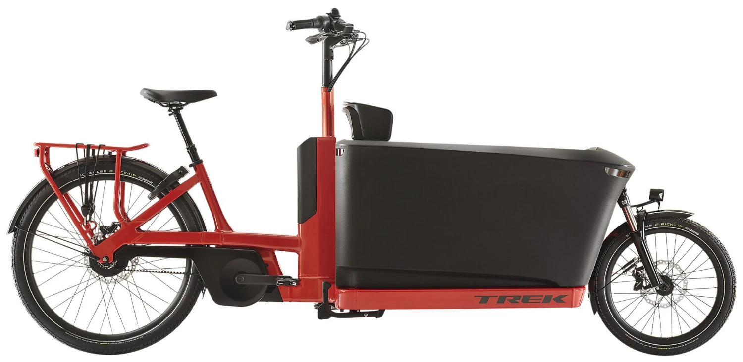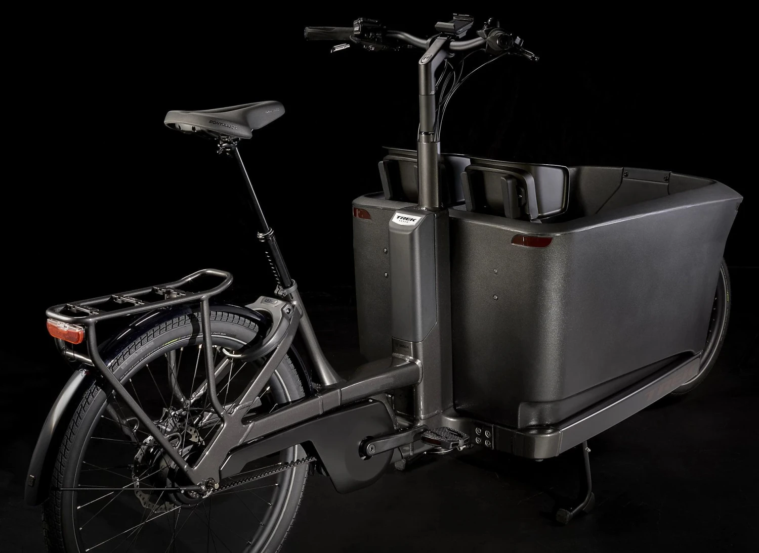 Année modèle: 2026 Type de vélo électrique: Vélos cargo et vélos utilitaires Système d’entraînement: Moteur Bosch Fabricant: Trek Capacité de la batterie: 700 Wh – 799 Wh Moteur Bosch: Bosch Cargo Line à partir de 2022 Smart System Cadre: Cadre en aluminium haute performance avec tubes hydroformés, design lowstep, batterie intégrée amovible, passage des câbles interne, Motor Armor, fixation des freins à disque Post Mount, axe traversant 148×12 mm Batterie: Bosch PowerTube 750 Wh, système intelligent Pneus: Schwalbe Pick-Up, Addix E-Compound, conforme à ECE-R75, tringle à fils, 20×2,35″ // Schwalbe Pick-Up, réfléchissant, tringle à fils, Super Defense Carcass Construction, 60-584 Selle: Bontrager Boulevard Tige de selle: TranzX JD-YSP28PLQ, course de 200 mm, guidage interne du câble, 31,6 mm Poids: 75 kg Suspension avant: SR Suntour Mobie A32, 50mm de débattement Potence: Bontrager, aluminium, diamètre de serrage 31,8 mm, 35 degrés, longueur 90 mm Garde-boue: Trek Fetch Custom Plateau: Gates CDX, 50 dents Poignées: Bontrager Satellite Elite, collier de serrage en aluminium Moteur: Bosch Cargo Line, Smart System, boîtier moteur en magnésium, 85 Nm Eclairage arrière: Trelock LS614 avec feu de stop Eclairage avant: Herrmans MR8e, 180 lumens, 60 lux Pedales: Pédales de ville Bontrager Moyeu avant: Formula DC-71, aluminium, roulements étanches, fixation de disque 6 trous, axe traversant 15 x 100 mm Guidon: aluminium, serrage de 31,8 mm, hauteur de 25 mm, largeur de 630 mm Manivelle: ProWheel, aluminium, longueur de manivelle 170 mm Cassette: Gates CDX, 22 dents, acier Levier de vitesse: Enviolo Pro, poignée tournante de changement de vitesse manuelle avec affichage Chargeur: Chargeur standard Bosch 4 A, 230 V, Smart System Béquille: Béquille Fetch Custom Disque de frein: Tektro Wave, 6 trous, 180 mm Unité de commande: Bosch BSP3200 SmartPhone Grip Frein: Frein à disque hydraulique à 4 pistons HD-T737 charge maximale: 250 kg (vélo, conducteur, charge utile)