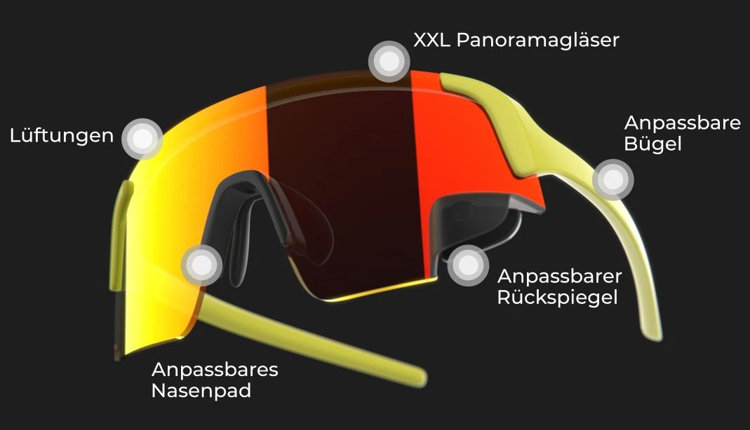 - Technologie de miroir innovante : assimilez sans effort les lunettes TriEye à un rétroviseur de voiture afin de toujours garder un œil sur la circulation derrière vous. Un simple coup d’œil suffit pour évaluer correctement la situation.